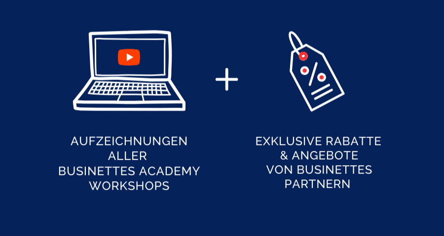 In der Businettes Mediathek findest du alles, was du brauchst, um deinen Alltag als Gründerin erfolgreich zu gestalten. Du erhältst uneingeschränkten Zugang zu den Masterclasses unserer Businettes Academy: einer umfangreichen Sammlung von Workshop-Aufzeichnungen mit wertvollen Einblicken und praxisnahen Tipps speziell für Gründerinnen. Zusätzlich profitierst du von exklusiven Angeboten und Vergünstigungen von (Software-)Produkten für deinen Business-Aufbau im Wert von über 1.000 €, die dich bei jedem Schritt deiner Gründung unterstützen. Damit bist du bestens ausgestattet, um deine Vision in die Tat umzusetzen.