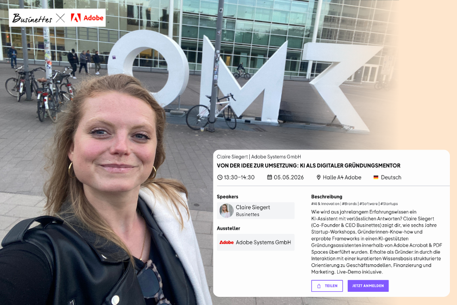Ein echtes Full-Circle-Moment für Businettes: Was ursprünglich vor Jahren als Idee in unserem EXIST-Antrag gestartet ist – ein Step-by-Step Gründungsbegleiter von der Idee zum fertigen Pitchdeck für (angehende) Gründerinnen – wird jetzt, mit den Möglichkeiten von KI und in Zusammenarbeit mit Adobe, endlich Realität.